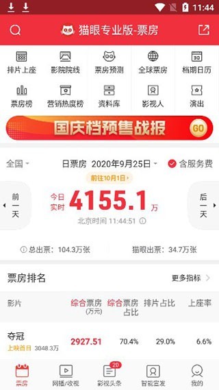 4、进入猫眼全网实时热度页面,能够查看猫眼热度、腾讯热度、平台播放量、直播关注度等各类数据。
