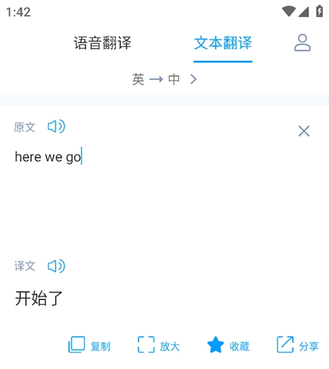 3、例如使用文本翻译进行英译汉,在下方输入框输入对应的英语文本,点击右侧的✓进行翻译,可以对翻译的内容进行复制、收藏以及分享;