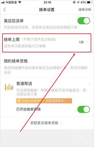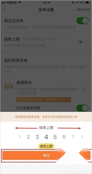 3、点击【接单设置】,选择接单上限数量(新手建议2单),然后点击确定。
