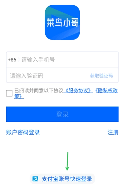 1、菜鸟小哥首先要完成账号注册或登录,也可以通过支付宝账号实现快速登录