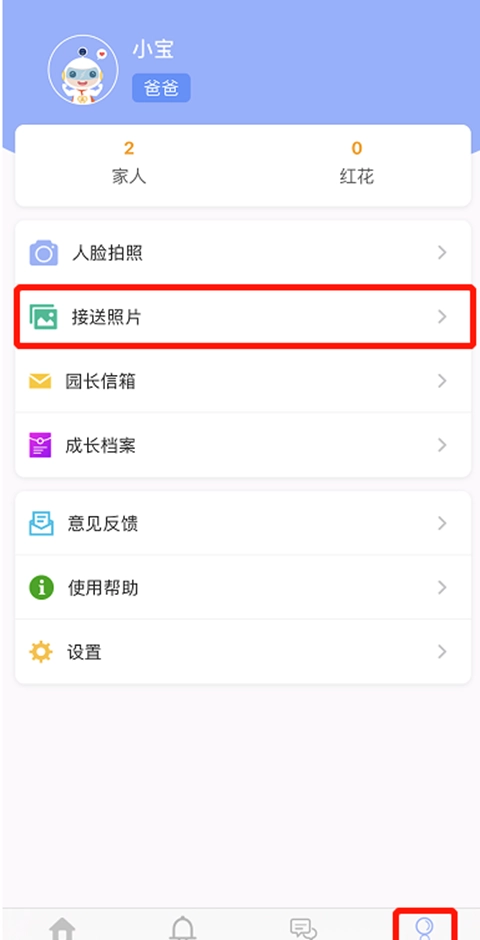 3、进入我的---接送照片---选择要录入的家长一位家长可以为邀请过的多个家庭成员录入人脸;