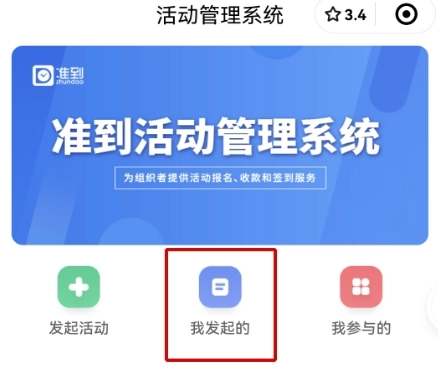 打开微信,搜索“准到活动管理系统”小程序,进入后点击“我发起的活动”选项。