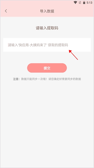 此时输入“快应用-大姨妈来了”来获取提取码,点击提交按钮就能导入数据了。需要注意的是,数据仅支持同步一次,使用时请务必谨慎。
