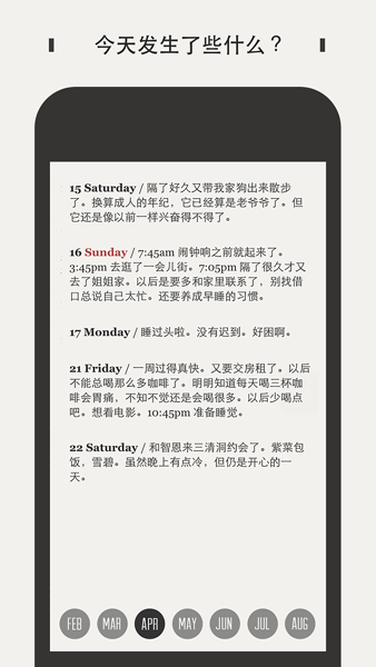 回顾功能:通过时间轴的显示方式,用户可以方便地回顾自己过去的日记,重温美好的回忆。