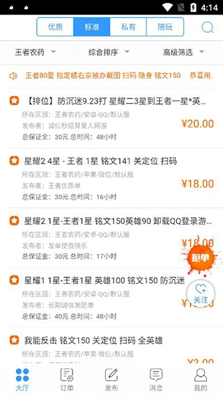 2、在标准大厅中,我们可以看到代练的单子,找到了就可以接单;