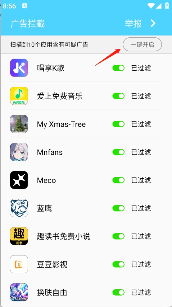 开启过滤广告功能即可,也可以选择一键开启。