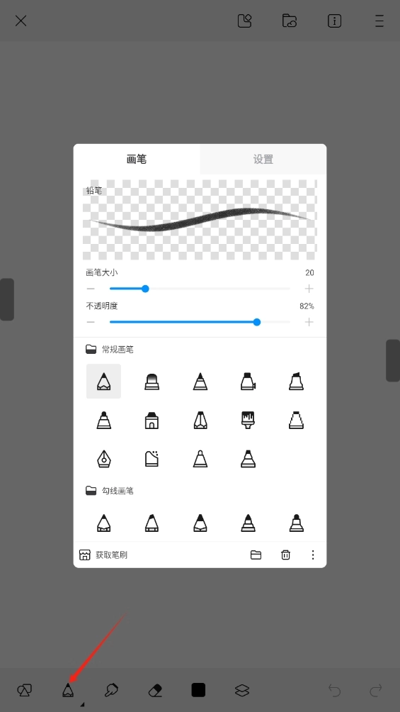 下方工具栏里,按顺序排列着形状、画笔、橡皮擦、调色板等绘画时最常用的工具,具体如下面的图所示。点击画笔工具,就能选择不同的画笔类型,还可以对画笔大小进行设置。