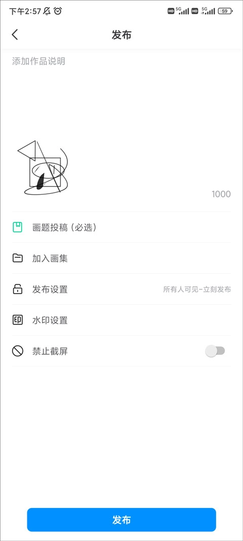 点击打开后就能进入发布界面,在这个界面里,你需要添加作品说明,同时还能使用画题投稿说明、发布设置、水印设置等功能进行相关配置。