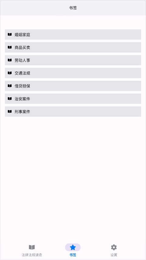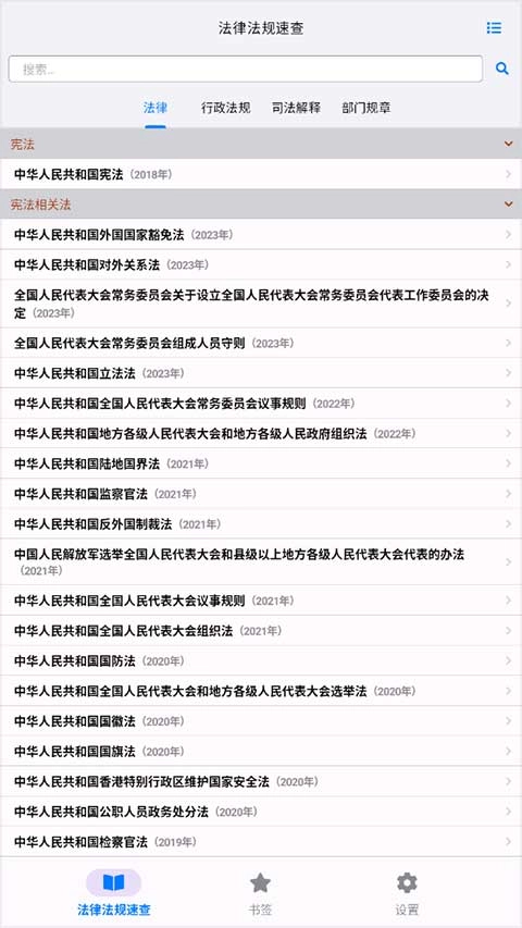 打开软件后,进入法律法规速查页面,既可以翻阅浏览,也能通过上方的搜索栏快速查找所需法条。