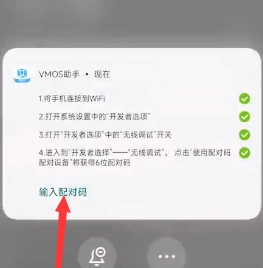 8.手机会自动生成6位数的配对码,生成后下滑打开通知中心,在VMOS助手的通知里点击“输入配对码”,配对成功后,前期准备工作就完成了。