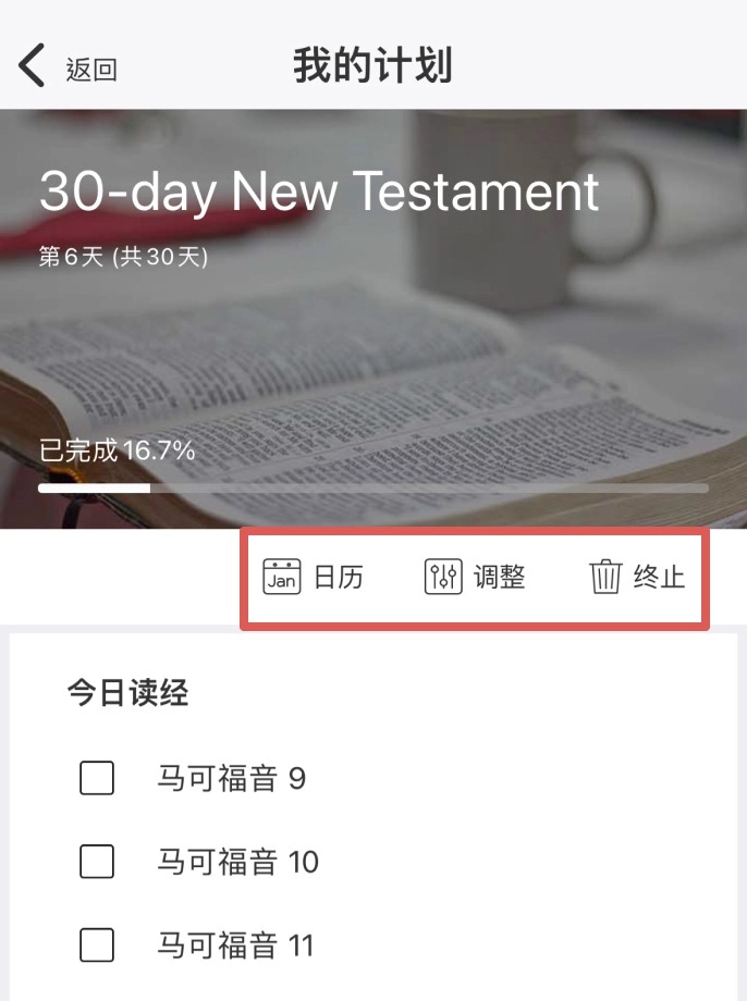 2.使用“日历”查看本月读经情况,“调整”计划开始天数,或“终止”计划。