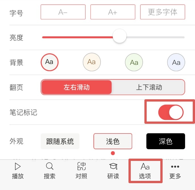 2.在弹出的选项中,找到“笔记标记”右侧的开关。