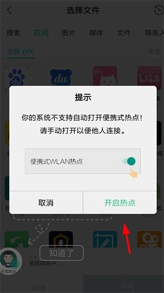 2、接下来进入到选择文件的页面里,在手机里面开启便携式热点,让其他手机进行连接,从而互传文件。