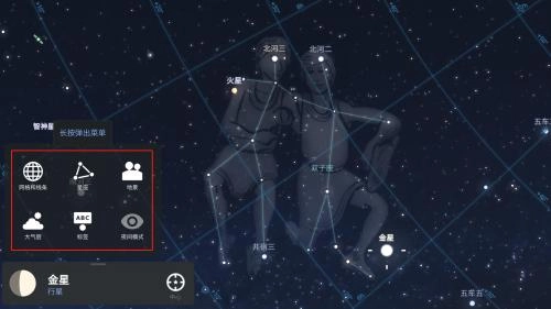 2、就可以显示网格和线条、星座、地景、大气层、标签,还可以设置夜间模式;
