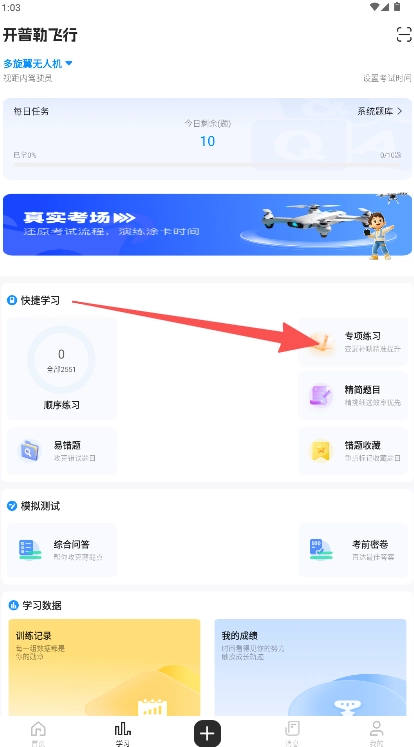 《开普勒飞行》的界面布局简洁明了,能够支持多旋翼无人机等不同机型的切换操作。顶部横幅着重突出了真实考场模拟这一核心功能,下方则划分出快捷学习、模拟测试和学习数据三大功能板块。该软件的特色之处在于紧密贴合无人机驾驶员认证考试的具体要求,配备了顺序练习、易错题汇总、错题收藏等具有针对性的学习工具。而它的优势体现在学习路径清晰明确,借助真实考场模拟以及学习进度跟踪功能,助力使用者有条理地掌握考试知识点,从而切实提高备考的效率。