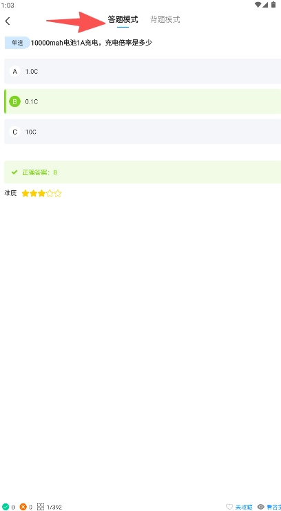 在界面上确认“答题模式”,完成题目后系统会自动展示正确答案和解析。