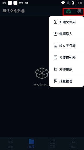进入文件管理界面后,点击右上角的按钮,即可进行音频导入与云传输相关操作。