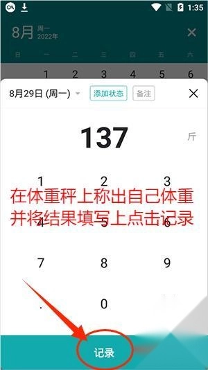 2、选择今日的日期点击记录,称重并填写今天的体重,点击记录。