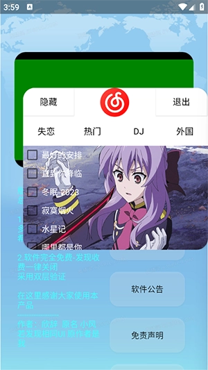 主要功能是免费收听网易云平台上的各类歌曲,涵盖失恋、热门、DJ等不同风格,只需点击想听的歌曲就能直接播放。