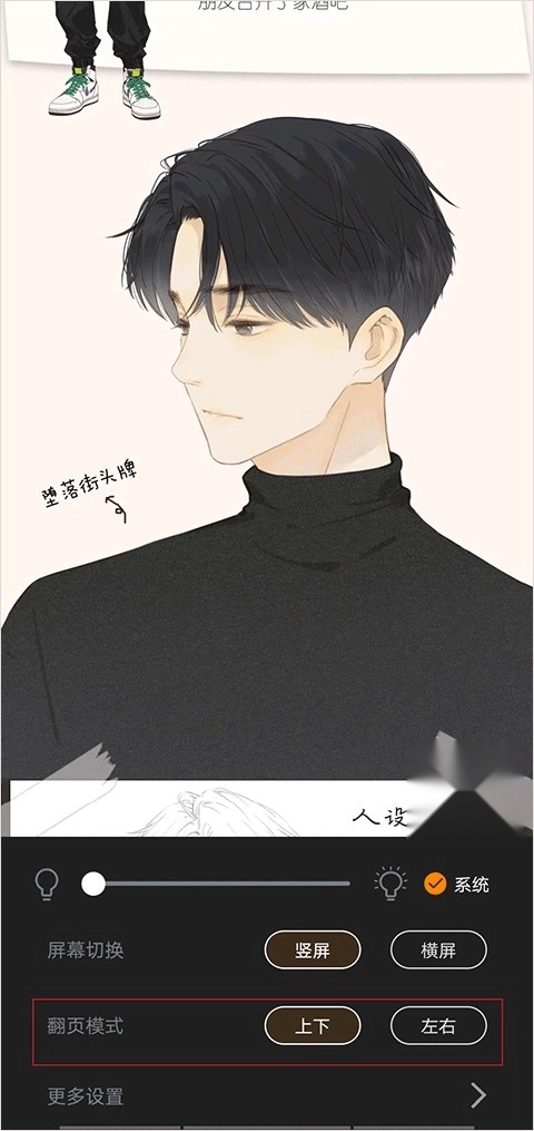 2、同样是在漫画界面点击界面会显示设置,在设置中可以切换翻页方式,选择你习惯的方式即可。