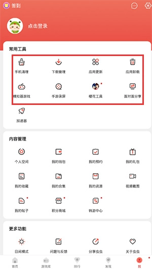 进入“我的”页面,你可以找到手机清理、设备管理、应用更新或卸载以及加速器等功能。