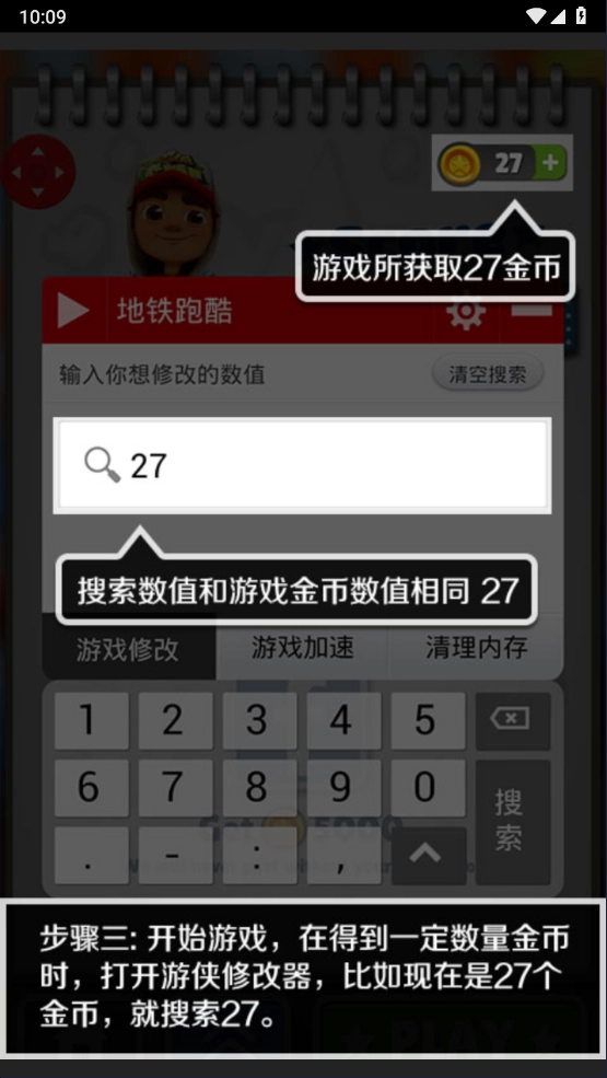 3、开始游戏,得到一定数量金币时,打开游侠,比如现在27个金币就搜索27个