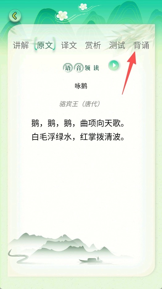 2、在诗词页面,可切换原文、译文等板块,借助语音领读辅助学习。