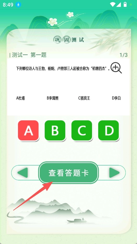 3、进入测试环节后,完成答题并点击查看答题卡,以此巩固诗词知识。