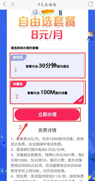 根据自身需求,选择如图1所示的“语音版”,或是如图2所示的“流量版”,然后点击3“立即办理”,稍作等待即可。