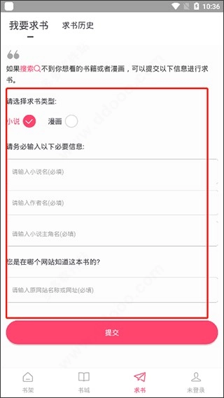 4、并且,要是你找不到想看的小说或漫画,还能在线发起求书,功能相当实用。