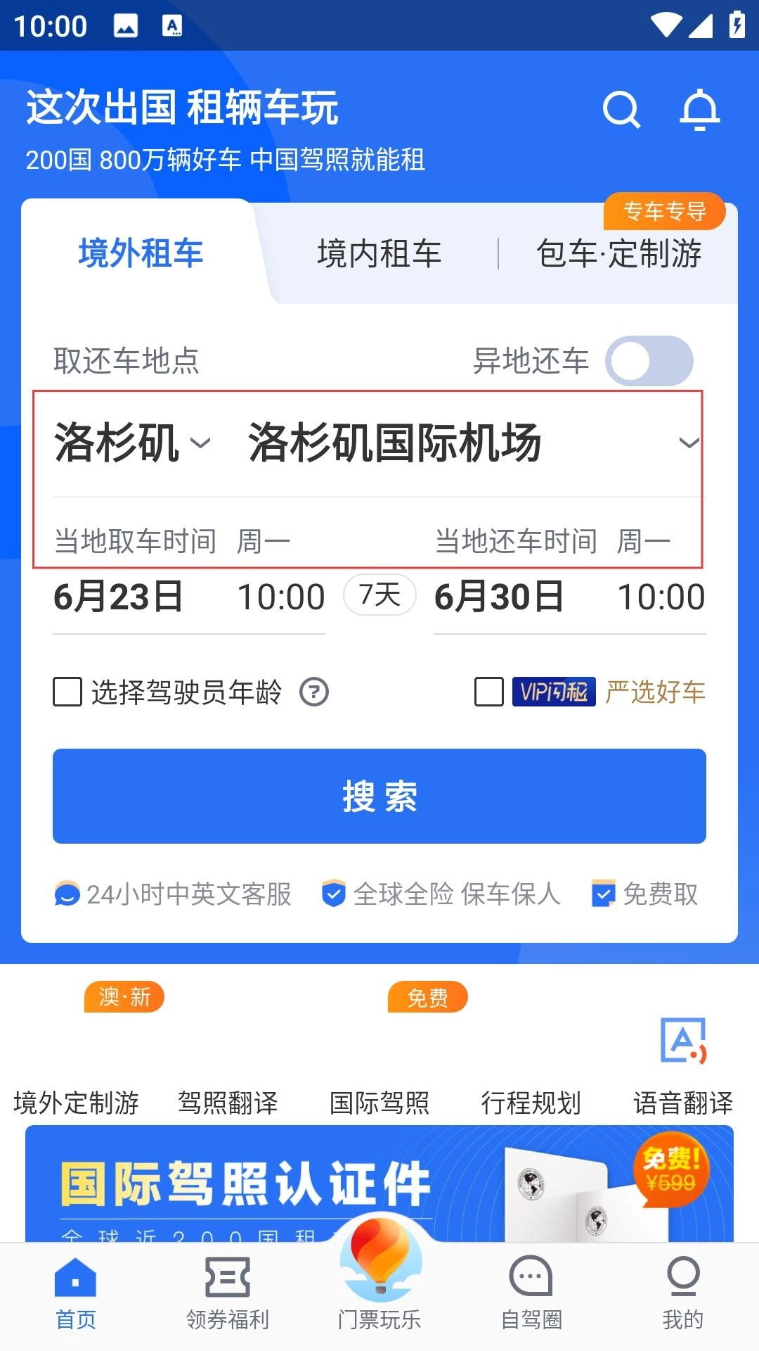 1、阅读温馨提示,同意后进入首页,选境外租车,填取还地点,定时间,点搜索,找车辆。