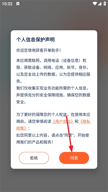 首先启动获客开单助手,仔细阅读并同意其中的“个人信息保护声明”。