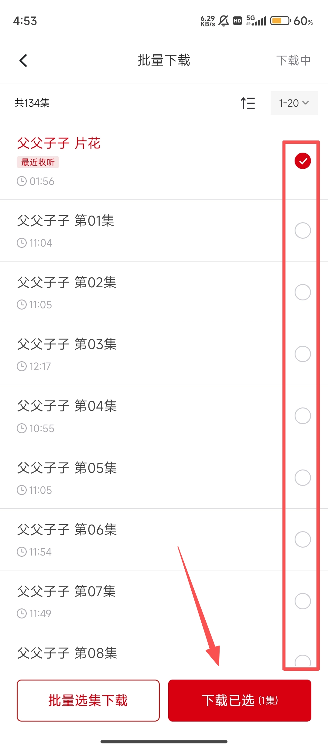 4、在批量操作页面,勾选需要的集数后点击【已选】按钮,就能把有声书下载到本地,方便随时收听啦。
