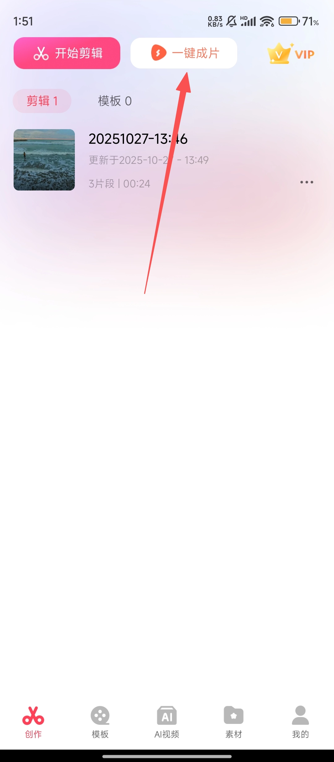 1、启动快剪辑应用,找到并点击【一键成片】功能按钮,就能快速进入用照片制作视频的便捷流程啦。