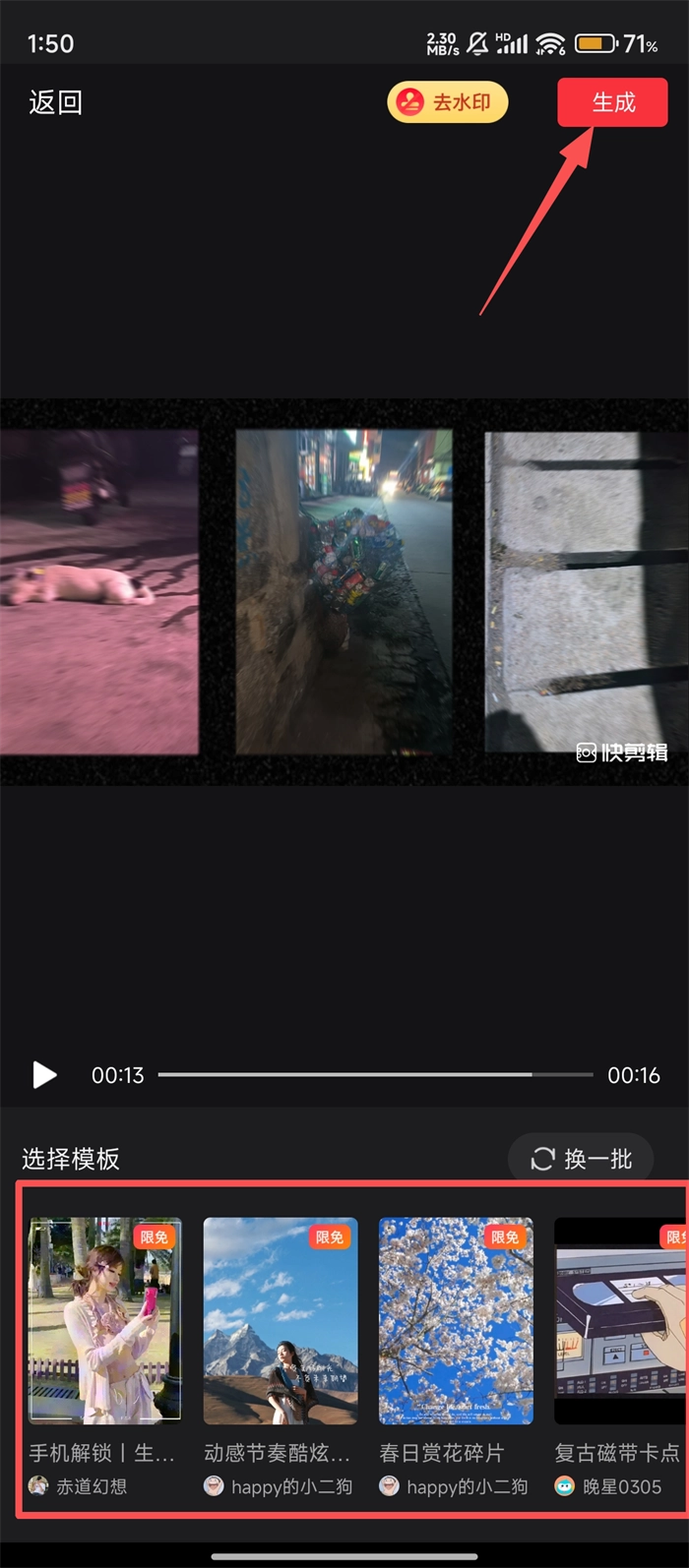 3、导入照片后,挑选心仪的视频模板,再点击右上角的【生成】按钮,就能迅速制作出视频了。