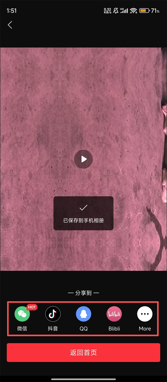 视频生成完成后会自动保存至手机相册,您还能把它分享到微信、抖音等平台,让更多人欣赏到您的作品。