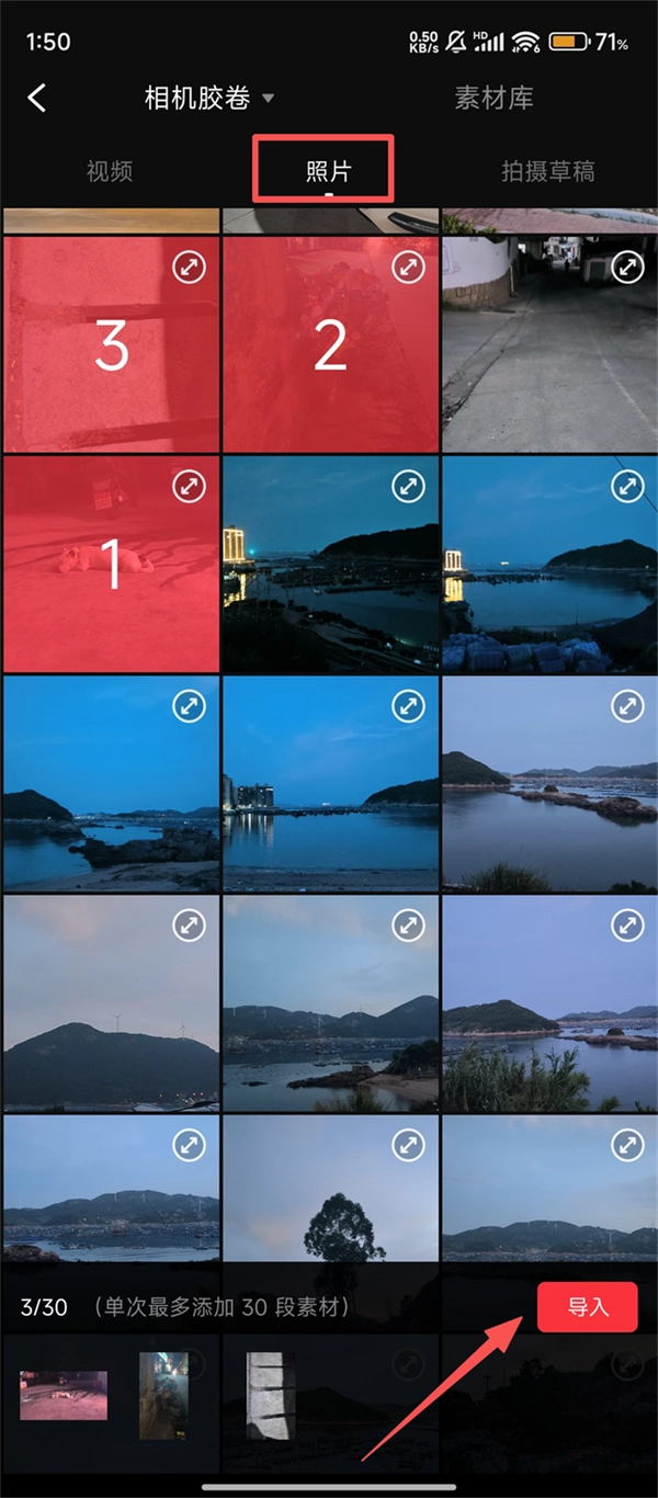 2、进入素材选择界面后,在【相机胶卷-照片】这个分类里找到并挑选你需要的照片,接着点击【导入】按钮,这样就能把选中的照片素材添加进来啦。