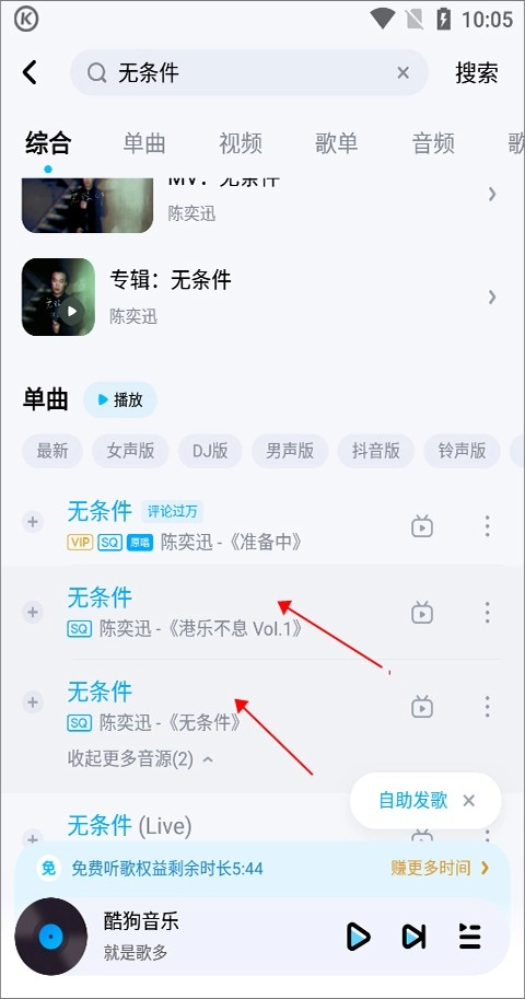 2、部分歌曲存在多个音源,其中一些音源支持免费播放,像《无条件》这首歌,用户搜索时呈现的是VIP标识,但点击【更多音源】后