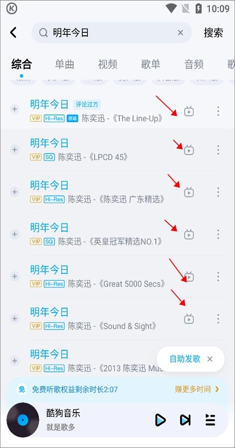 3、要是歌曲没有多个音源,像《明年今日》这种情况,用户就可以点击它右边的MV图标(下图红色箭头指向的位置)