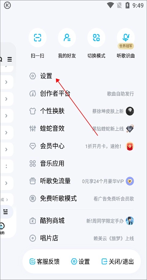 1、打开酷狗音乐,点击右上角的箭头指示标志。