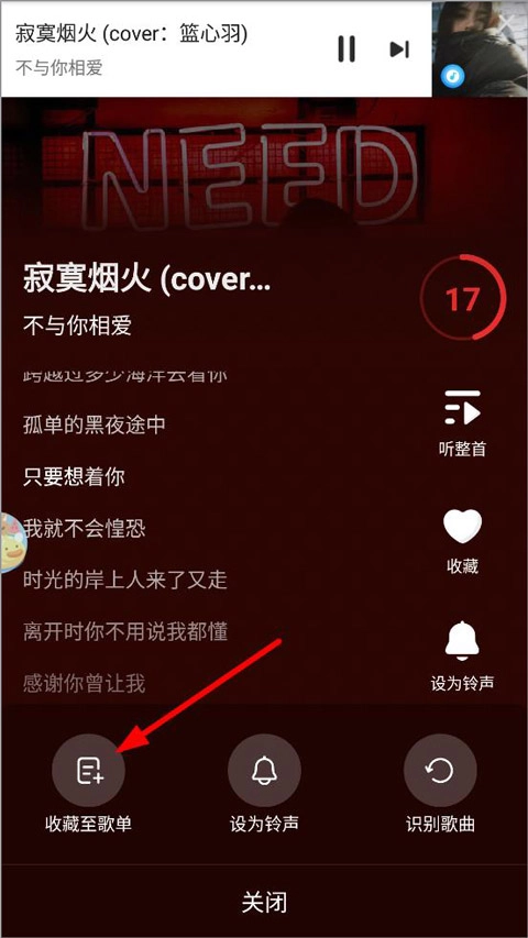 3、在弹出的选项列表中选择“收藏至歌单”。