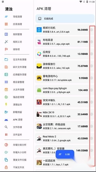 扫描结束后,软件会把手机里所有可供选择的文件都列出来,这时候你可以按照自己的需求勾选那些想要删除的文件。