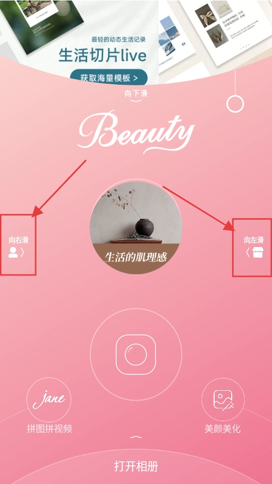 1、页面支持左右滑动切换内容,还具备拼图拼视频、美颜美化等实用功能,若想挑选模板,点击【获取海量模板】即可,操作十分便捷。
