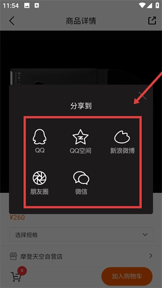 4、在分享弹窗中选择对应渠道(如QQ、微信等),完成商品分享操作。
