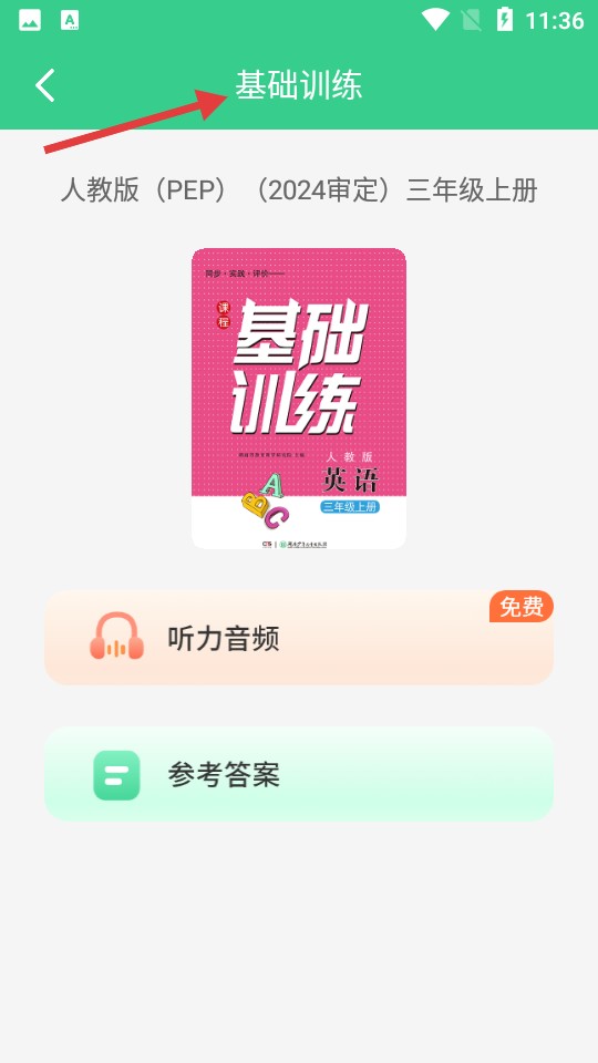 2、基础训练页面对应人教版三年级上册教材,提供免费听力音频,还有参考答案查看功能。