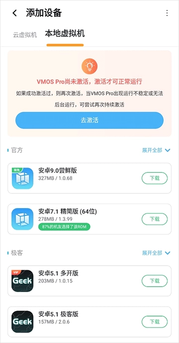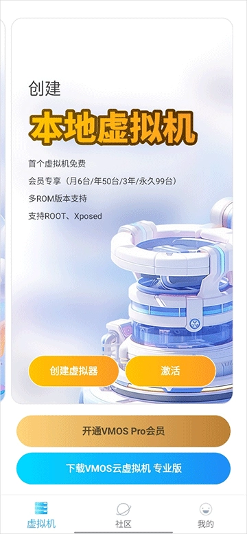 打开应用后,我们需要选择想要创建的虚拟机类型(包括云虚拟机和本地虚拟机,其中云虚拟机需要充值会员才能使用),在这个场景下,我们选择创建本地虚拟机。