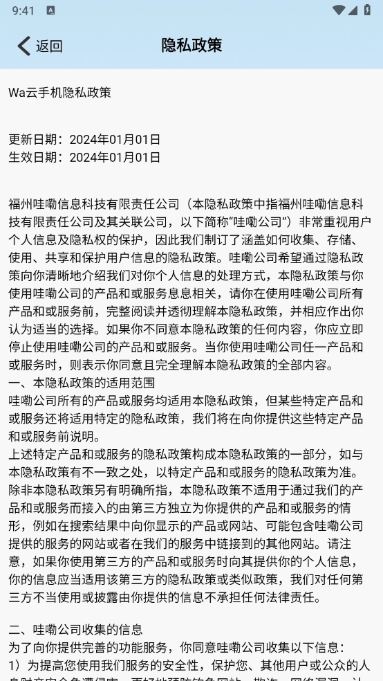 Wa云手机是福州哇嘞信息科技有限责任公司推出的云手机平台,能够让一部手机同时登录多个账号,无论是游戏娱乐还是日常办公场景都适用;它可以生成多个独立运行的操作空间,使用过程中不会消耗本地流量,也不会导致手机出现卡顿问题。