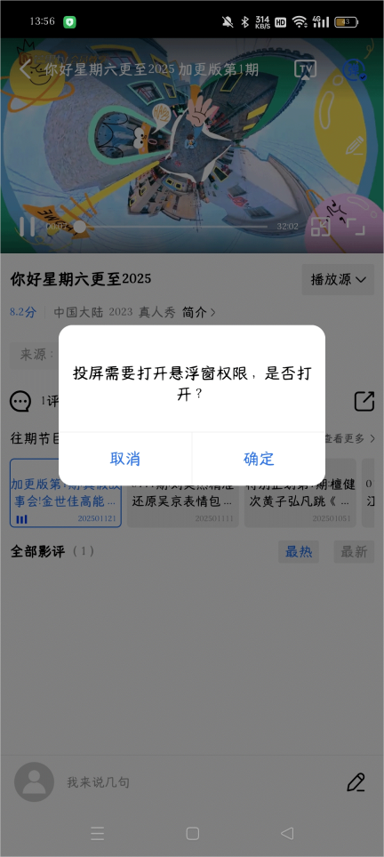 2、只需一键点击进入,但需先开启悬浮窗权限才能进行投屏,请点击"确定"。
