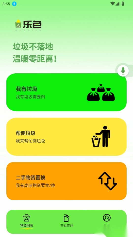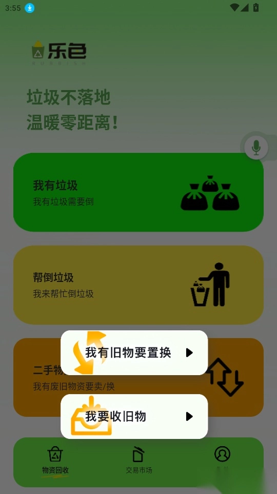 乐色是一款便捷环保的物资回收交易平台,用户能通过拍照发布垃圾清运需求获取相应服务,也可承接各类垃圾清运订单,轻松赚取收入;还能随时在线发布二手物资置换或变卖需求,让闲置物品快速变现。平台会实时定位并推荐附近的废品回收站,支持一键导航前往处理废品。多样化的回收交易服务,方便用户随时在线操作,有需要的用户不妨来体验乐色吧!