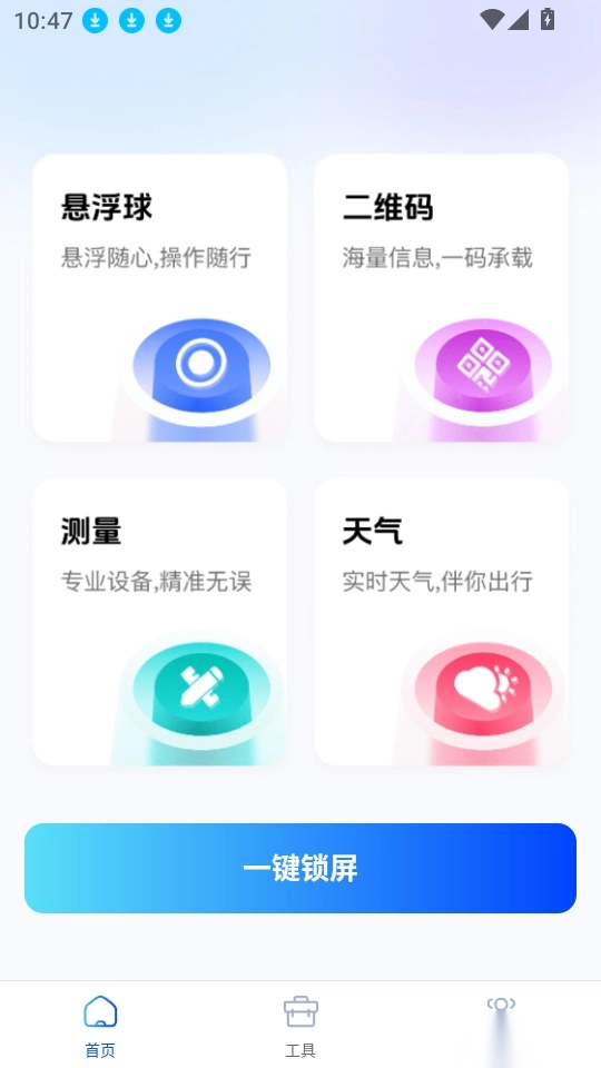 一键锁屏快捷手机版是一款专注于为用户提供便捷锁屏服务的工具类应用。它具备强大的功能,能让用户通过简单操作实现一键快速锁定手机屏幕,轻松上手的同时,有效保护个人隐私安全,防止他人误触或偷窥,时刻守护屏幕安全。平台内还整合了多种实用工具,用户可按需选择使用,一站式解决各类需求,让生活更便捷;另外,该应用的免费版本还支持实时天气查询,方便用户查看未来天气预报,及时掌握天气变化动态,有需要的用户不妨立即前往本站体验使用!